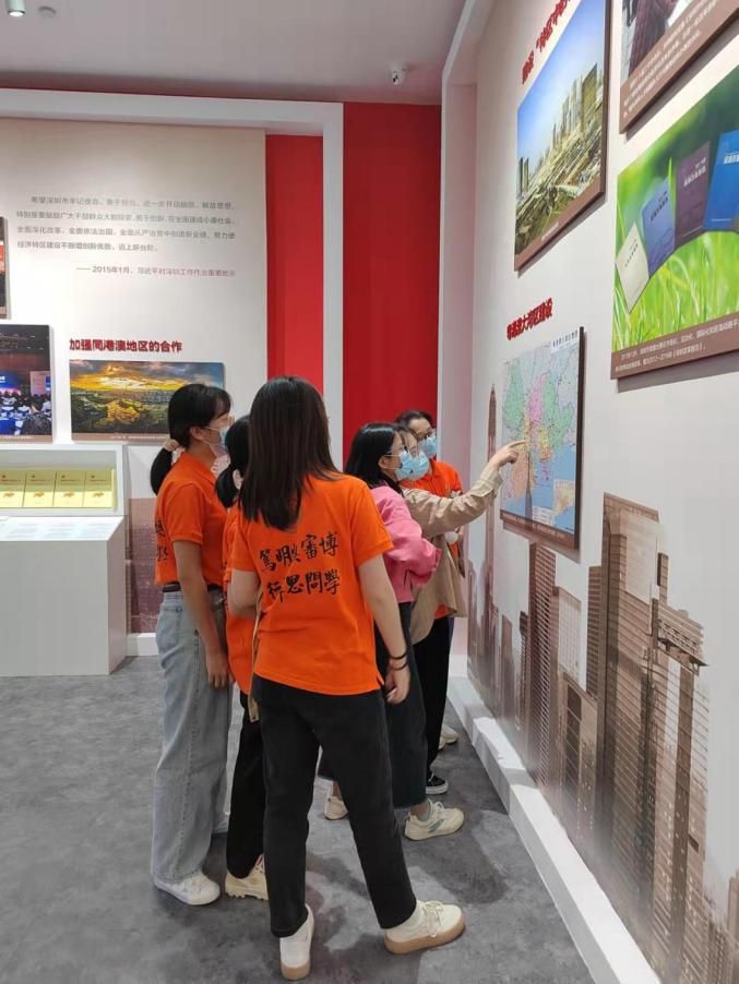 在深圳党史馆,师生党员统一佩戴党徽,循着历史发展脉络,先后参观了“红旗屹立深圳湾”“社会主义新宝安”“改革开放排头兵”“新时代的先行区”四部分展区,了解从解放宝安到建设边防,从“杀出一条血路”到“走出一条科学发展的新路”,再到加快建设中国特色社会主义先行示范区的历史进程。翔实的档案资料、生动的图片视频,展现了深圳改革开放和历史大潮中的伟大变革,吸引着党员们不时驻足观看,仔细阅读,认真思考。在参观学习中,党员们进一步了解到深圳特区在中国共产党领导下进行革命、建设和改革的不懈奋斗史、所取得的辉煌成就,为深圳经济特区敢闯敢试、敢为天下先的“拓荒牛”精神所鼓舞和震撼!