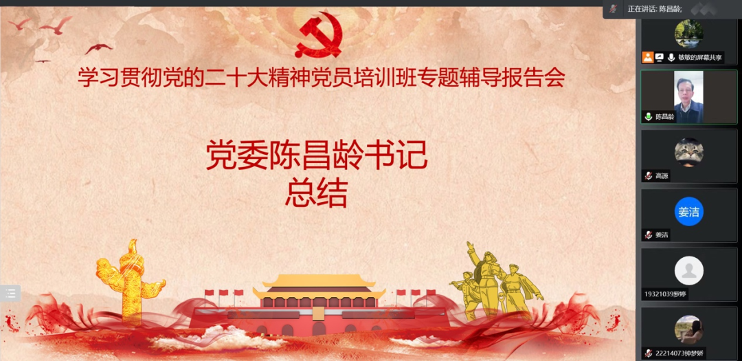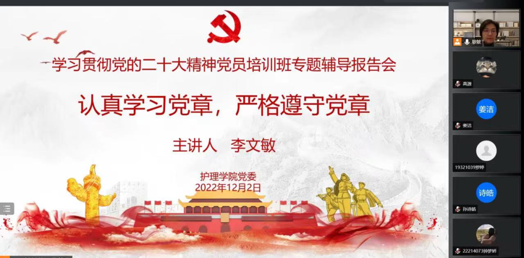 根据学院学习贯彻党的二十大精神党员培训班方案安排,12月2日晚上7点,bet365手机版 通过腾讯会议线上举行第二次专题辅导报告会。本次报告会由学院党委副书记李文敏同志主讲,主题为“认真学习党章,严格遵守党章”。学院全体党员、发展对象、入党积极分子以及部分学生马克思主义学习小组成员约230人参加了报告会。报告会由学院党委书记陈昌龄同志主持。