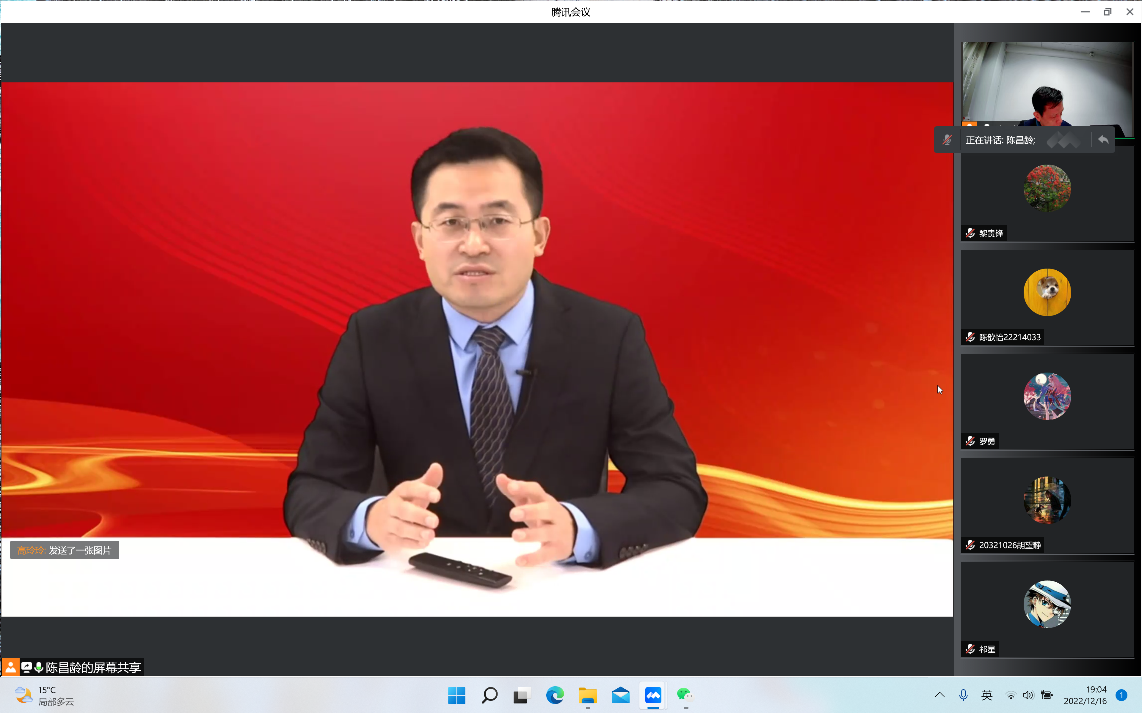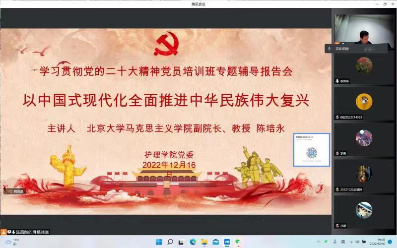党委通过腾讯会议举行学习贯彻党的二十大精神党员培训班第三次专题辅导报告会。本次专题辅导报告的主题是:以中国式现代化全面推进中华民族伟大复兴,主讲人为北京大学马克思主义学院副院长陈培永教授。学院全体师生党员、发展对象、入党积极分子以及马克思主义学习小组近200人集体收看了中国干部网络学院门户网站“学习贯彻党的二十大精神网上专题班”相关辅导报告视频。专题辅导报告会由学院党委陈昌龄书记主持。