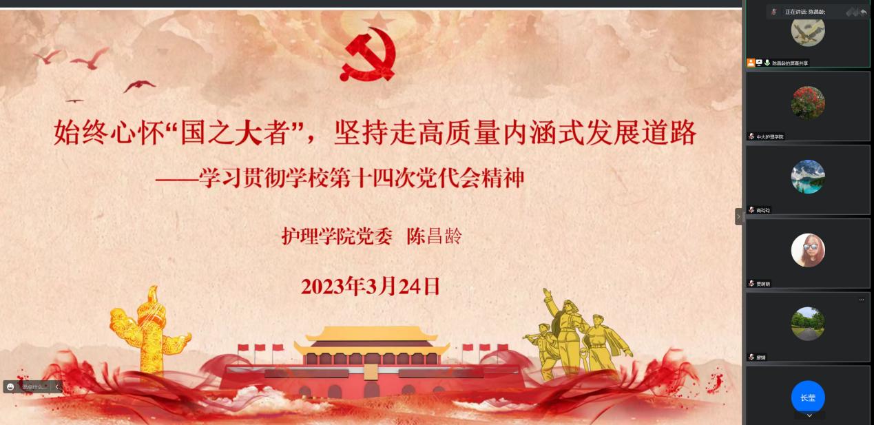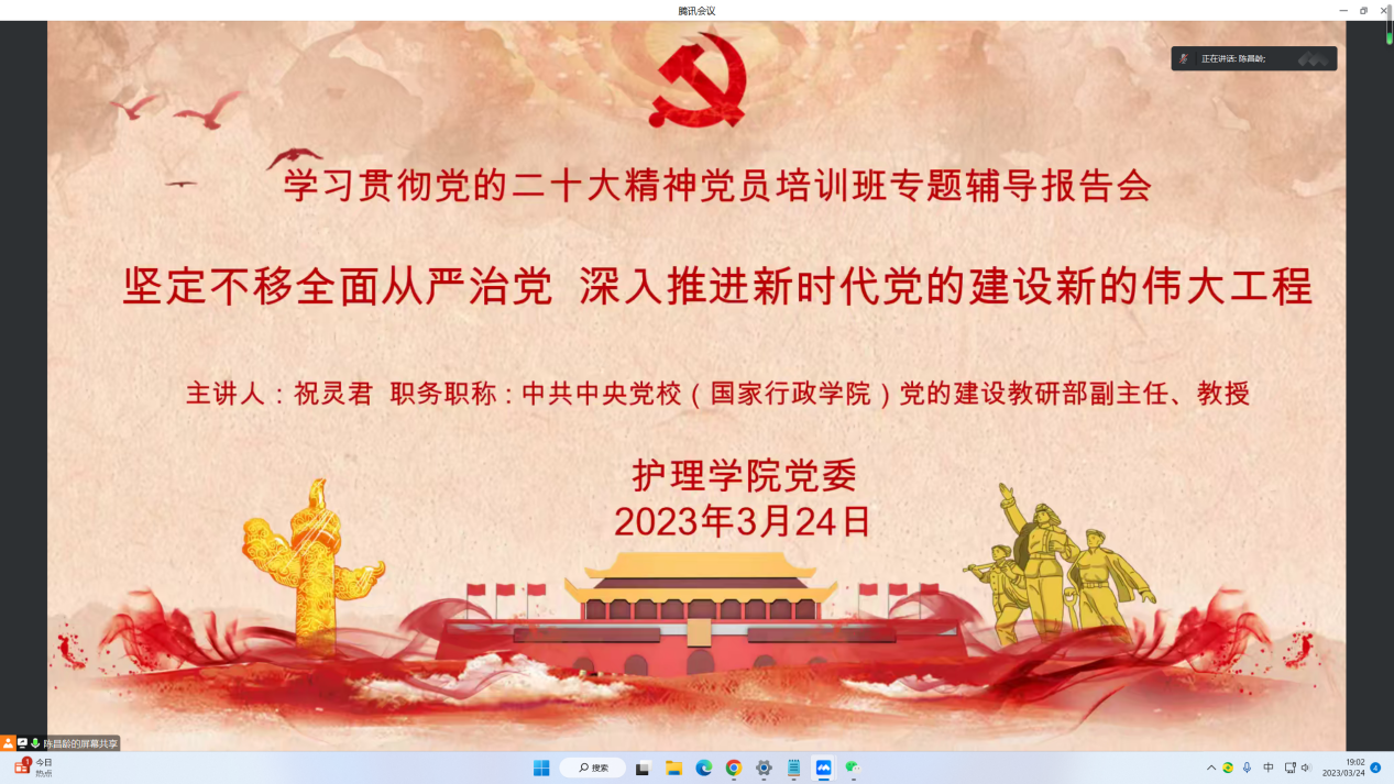 根据学院党委学习贯彻党的二十大精神党员培训班方案安排,3月24日晚上7点,bet365手机版 党委通过腾讯会议举行学习贯彻党的二十大精神党员培训班第五次专题辅导报告会。本次专题辅导报告的主题是:坚定不移全面从严治党  深入推进新时代党的建设新的伟大工程。主讲人为:中共中央党校(国家行政学院)党的建设教研部副主任祝灵君教授 。学院全体师生党员、发展对象、入党积极分子以及马克思主义学习小组成员近300人集体收看了中国干部网络学院门户网站“学习贯彻党的二十大精神网上专题班”相关辅导报告视频。专题辅导报告会由学院党委陈昌龄书记主持。