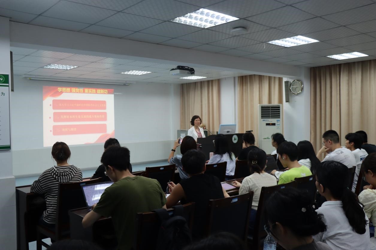 6月21日晚上,副院长万丽红在学院二楼东讲学厅为本科生党支部全体党员和发展对象讲授题为《学思想 强党性 重实践 建新功》的专题党课。万丽红首先谈了自己学习《习近平新时代中国特色社会主义思想专题摘篇》中“坚持以人民为中心”和“实施科教兴国战略,强化现代化建设人才支撑”等部分著作的体会。接着,万丽红结合实际,谈了本科生党支部应该如何落实主题教育“学思想、强党性、重实践、建新功”的总要求,发挥好战斗堡垒作用和党员先锋模范作用。万丽红最后强调,作为一名学生党员,要不忘初心、牢记使命,时刻牢记党员身份,牢记党员职责和使命担当,为健康中国战略贡献力量。