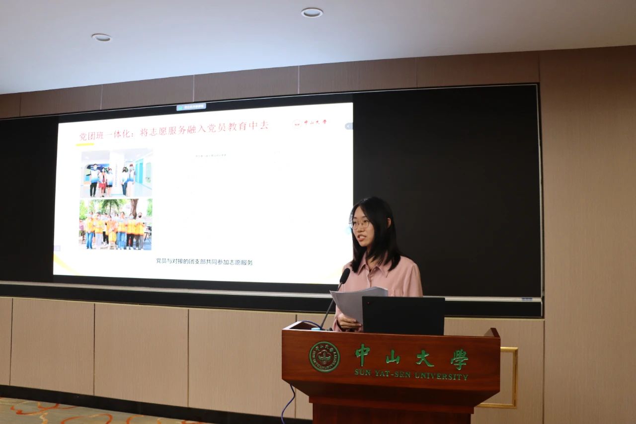 光华口腔医学院·附属口腔医院学生第六党支部杨果同志作题为“党建引领聚合力 志愿服务助发展”的工作分享她从讲党性、讲责任、讲担当三个方面介绍了本支部党建引领下志愿服务活动情况。支部党员知行合一,争当信念先锋、学习先锋和实干先锋,运用所学所长投身志愿服务,践行全心全意为人民服务的宗旨,同时在实践中接受锻炼、成长成才,朝着口腔临床科学家目标砥砺奋进。