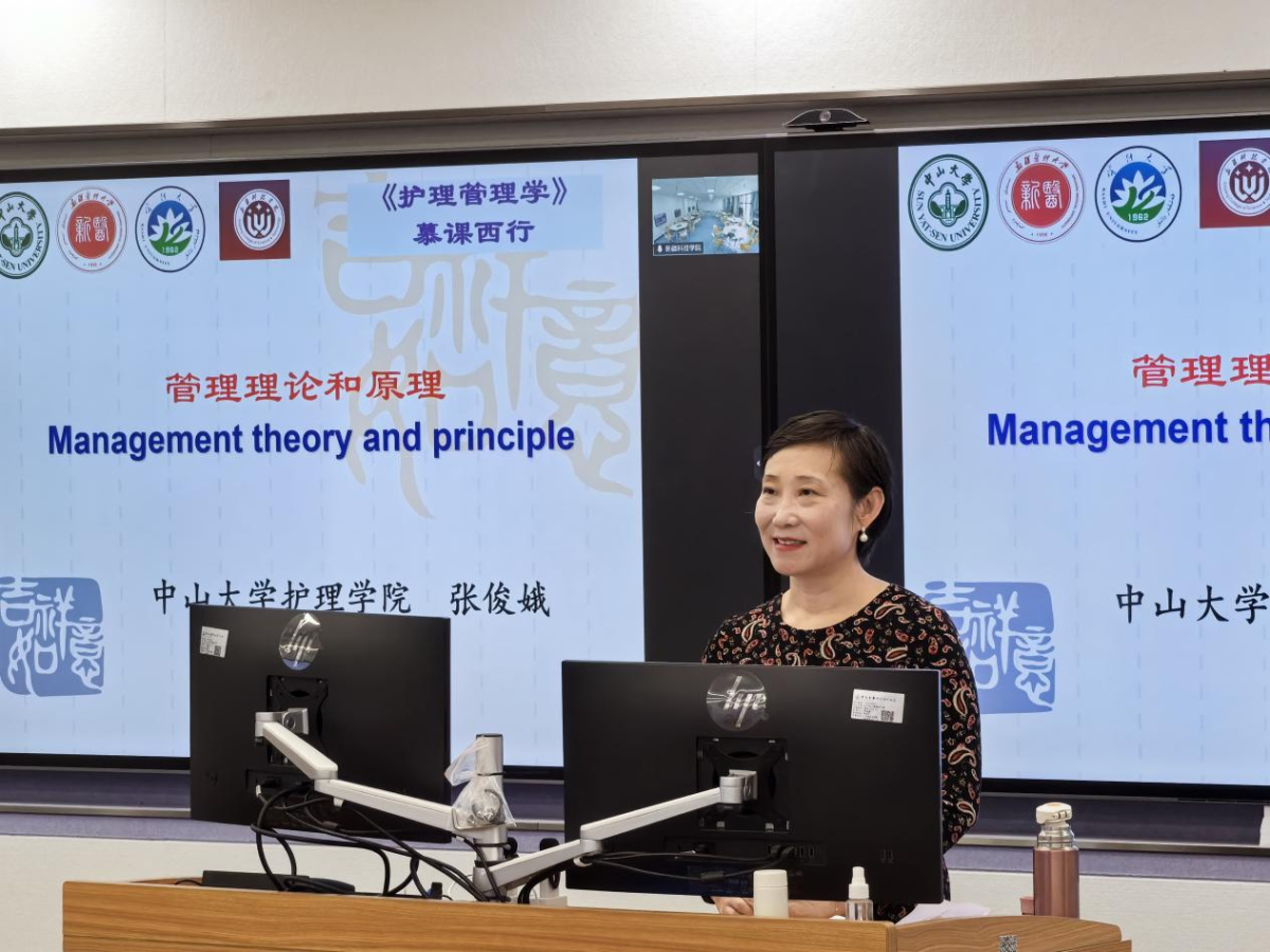 中山大学作为主讲阵地,新疆医科大学、喀什大学、新疆科技学院三所高校组织师生集中线上听课,全程同步参与、实时互动,四方协同、紧密配合,保障《护理管理学》课堂有序开展、高效运行,真正实现 “一地授课、多校共享、同步提升”。